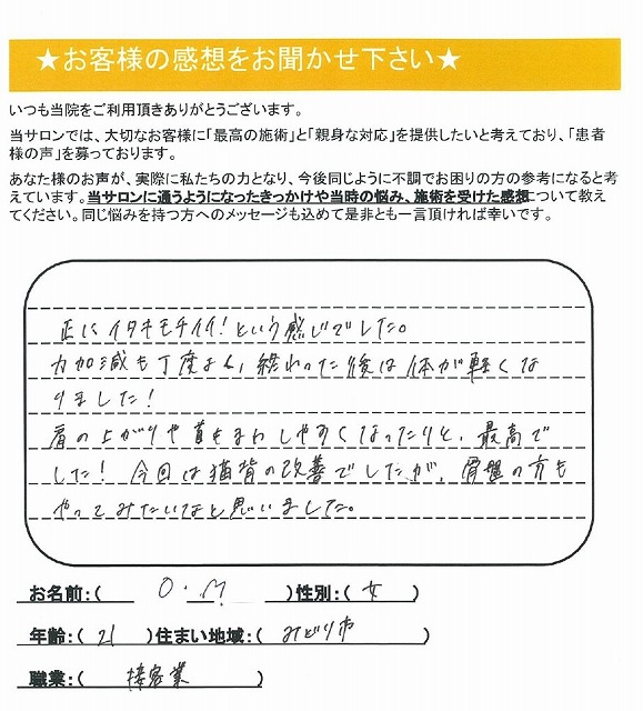 力加減も丁度よく、終わった後は体が軽くなりました!